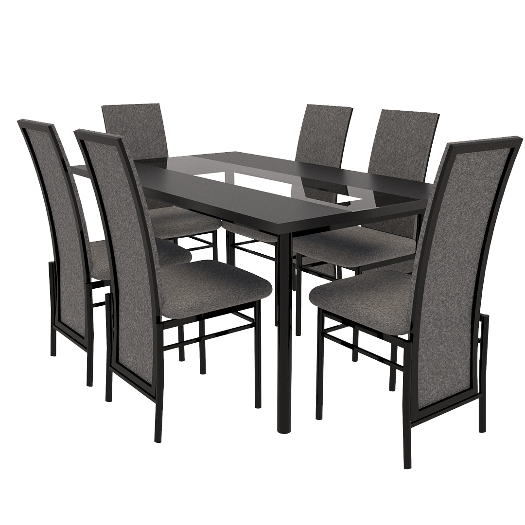 Comedor disponible para 6 personas Mesa rectangular con base de metal con tuberia industrial cuadrada, tablero en MDF con acabado mate en color negro que se complementa con las sillas.